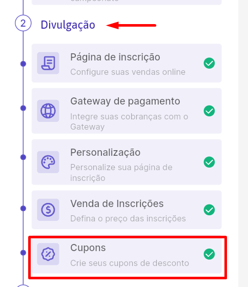 Oferecer cupons de desconto é uma ótima estratégia pra impulsionar as inscrições no seu campeonato.