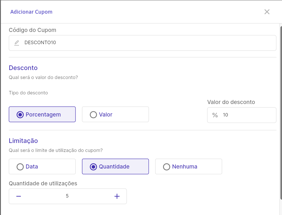• Limitação: escolha se o cupom será ilimitado ou terá restrições (número máximo de usos ou validade).