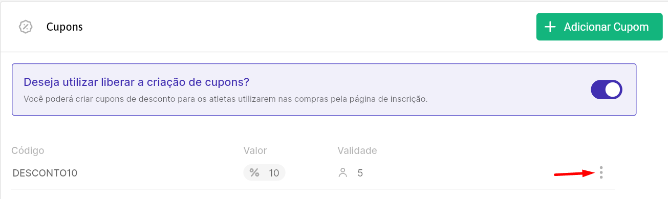 • Código do cupom: o código que o atleta digita na inscrição (ex.: DESCONTO10).