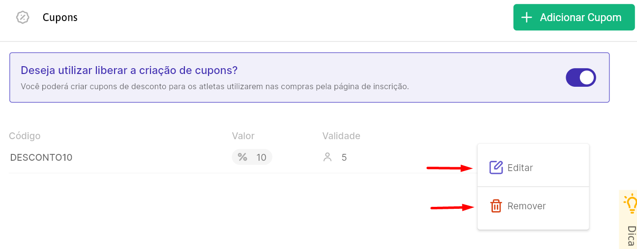 3. Editar ou remover um cupom existente